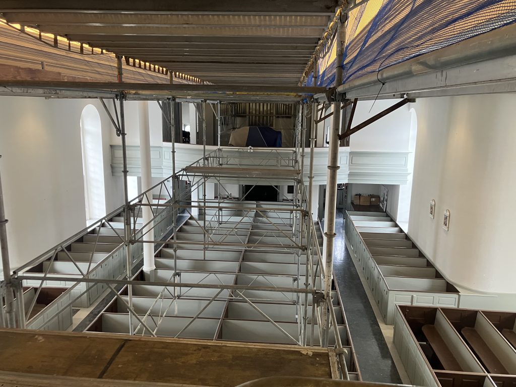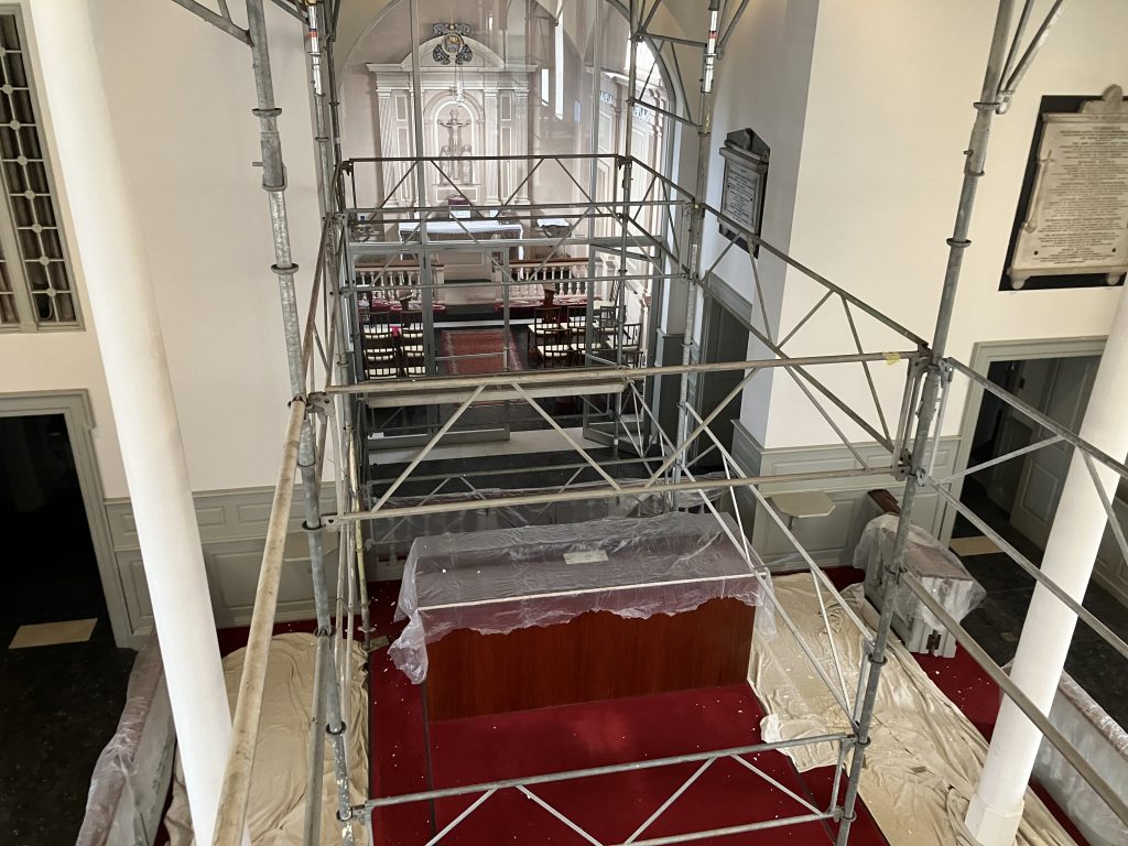 Here is a picture of the scaffolding as of February 15, 2026. Also, a picture of Mass being held in Cranmer House. We moved back into the church for Palm Sunday on March 29, 2026